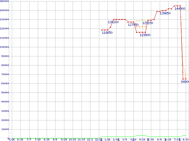 ※このグラフは過去のデータも税率5%相当に調整した税込み相当額のグラフです。 税率変更や、総額表示方式導入(2004年4月)の影響は除いています。 | | | ●凡例 | 最安値 (点線部は販売店未確認 または未調査) | 平均値 | 最高値 | ショップ数 |