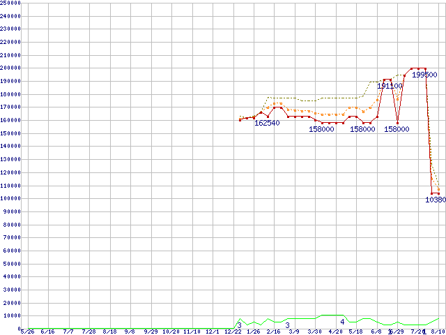 ※このグラフは過去のデータも税率5%相当に調整した税込み相当額のグラフです。 税率変更や、総額表示方式導入(2004年4月)の影響は除いています。 | | | ●凡例 | 最安値 (点線部は販売店未確認 または未調査) | 平均値 | 最高値 | ショップ数 |