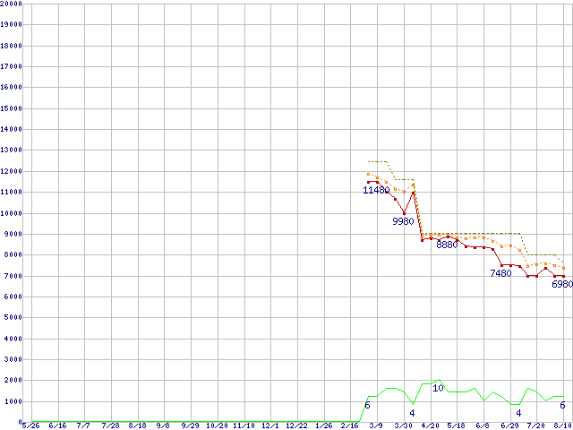 ※このグラフは過去のデータも税率5%相当に調整した税込み相当額のグラフです。 税率変更や、総額表示方式導入(2004年4月)の影響は除いています。 | | | ●凡例 | 最安値 (点線部は販売店未確認 または未調査) | 平均値 | 最高値 | ショップ数 |
