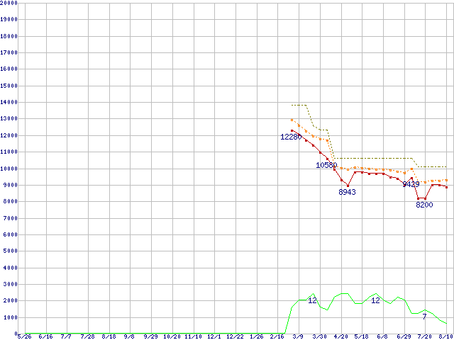 ※このグラフは過去のデータも税率5%相当に調整した税込み相当額のグラフです。 税率変更や、総額表示方式導入(2004年4月)の影響は除いています。 | | | ●凡例 | 最安値 (点線部は販売店未確認 または未調査) | 平均値 | 最高値 | ショップ数 |