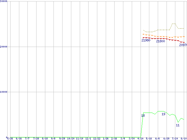 ※このグラフは過去のデータも税率5%相当に調整した税込み相当額のグラフです。 税率変更や、総額表示方式導入(2004年4月)の影響は除いています。 | | | ●凡例 | 最安値 (点線部は販売店未確認 または未調査) | 平均値 | 最高値 | ショップ数 |