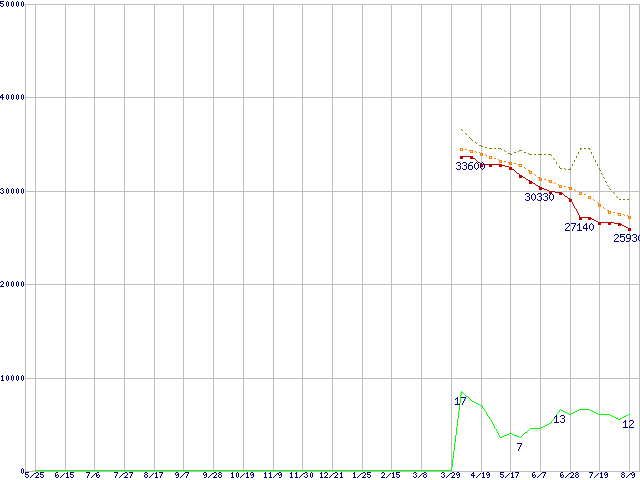 ※このグラフは過去のデータも税率5%相当に調整した税込み相当額のグラフです。 税率変更や、総額表示方式導入(2004年4月)の影響は除いています。 | | | ●凡例 | 最安値 (点線部は販売店未確認 または未調査) | 平均値 | 最高値 | ショップ数 |