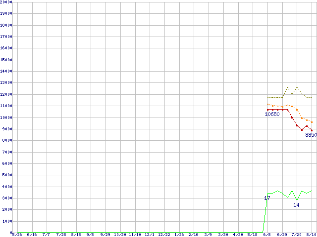 ※このグラフは過去のデータも税率5%相当に調整した税込み相当額のグラフです。 税率変更や、総額表示方式導入(2004年4月)の影響は除いています。 | | | ●凡例 | 最安値 (点線部は販売店未確認 または未調査) | 平均値 | 最高値 | ショップ数 |