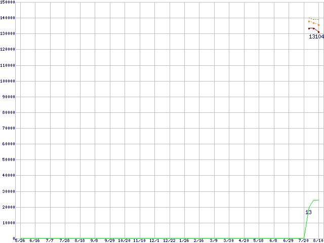 ※このグラフは過去のデータも税率5%相当に調整した税込み相当額のグラフです。 税率変更や、総額表示方式導入(2004年4月)の影響は除いています。 | | | ●凡例 | 最安値 (点線部は販売店未確認 または未調査) | 平均値 | 最高値 | ショップ数 |