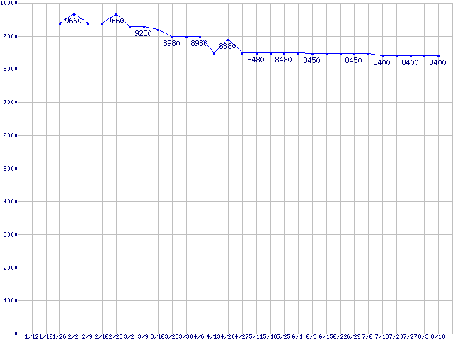 | LGA775 (FSB 800MHz,L2 2MB,Hyper-Threading,EM64T対応)の最安値推移 | | | (2007年1月12日~2007年8月10日) |