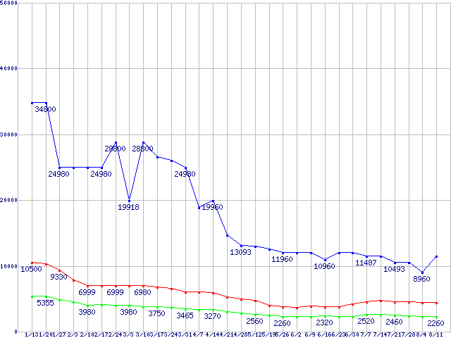 PC2-4200*(DDR2-533) DDR2 SDRAM DIMMの最安値推移