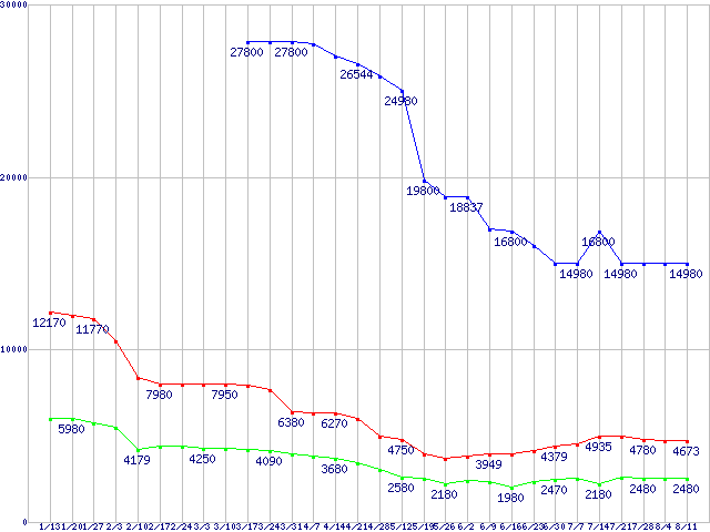 PC3200(DDR400) DDR SDRAM DIMMの最安値推移