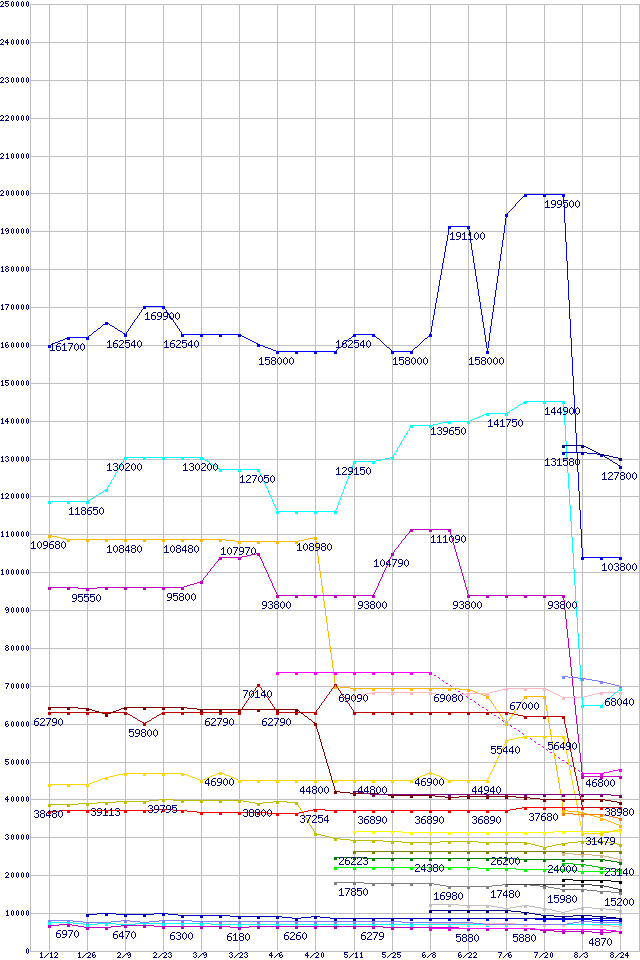 | Intel系CPUの最安値推移 | | | (2007年1月12日~2007年8月24日) |