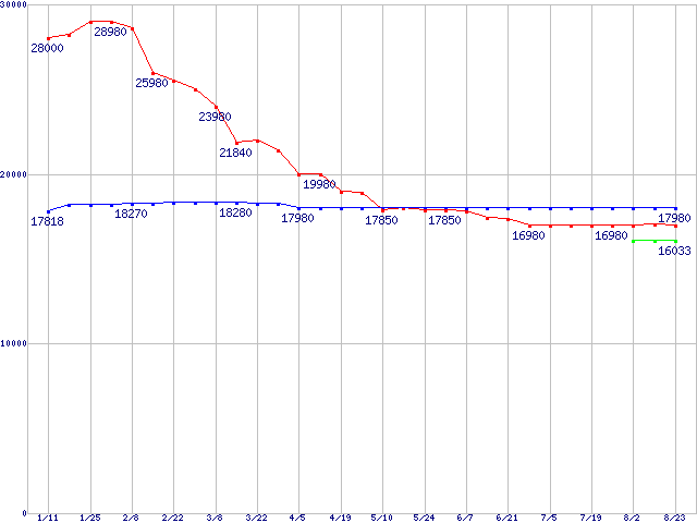 HDD主要製品(最安値1万5千円~2万円未満)の最安値推移