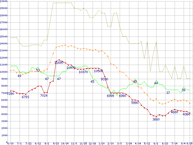 ※このグラフは過去のデータも税率5%相当に調整した税込み相当額のグラフです。 税率変更や、総額表示方式導入(2004年4月)の影響は除いています。 | | | ●凡例 | 最安値 (点線部は販売店未確認 または未調査) | 平均値 | 最高値 | ショップ数 |