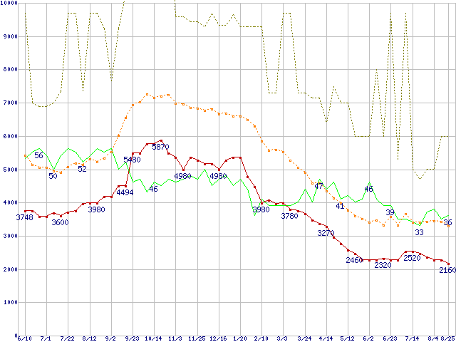 ※このグラフは過去のデータも税率5%相当に調整した税込み相当額のグラフです。 税率変更や、総額表示方式導入(2004年4月)の影響は除いています。 | | | ●凡例 | 最安値 (点線部は販売店未確認 または未調査) | 平均値 | 最高値 | ショップ数 |