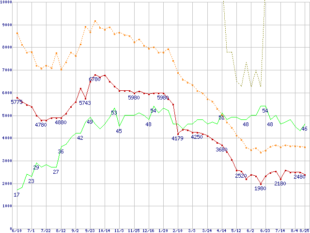 ※このグラフは過去のデータも税率5%相当に調整した税込み相当額のグラフです。 税率変更や、総額表示方式導入(2004年4月)の影響は除いています。 | | | ●凡例 | 最安値 (点線部は販売店未確認 または未調査) | 平均値 | 最高値 | ショップ数 |