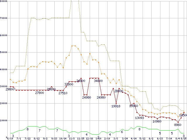 ※このグラフは過去のデータも税率5%相当に調整した税込み相当額のグラフです。 税率変更や、総額表示方式導入(2004年4月)の影響は除いています。 | | | ●凡例 | 最安値 (点線部は販売店未確認 または未調査) | 平均値 | 最高値 | ショップ数 |