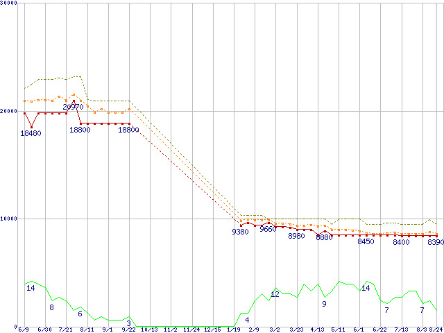 ※このグラフは過去のデータも税率5%相当に調整した税込み相当額のグラフです。 税率変更や、総額表示方式導入(2004年4月)の影響は除いています。 | | | ●凡例 | 最安値 (点線部は販売店未確認 または未調査) | 平均値 | 最高値 | ショップ数 |