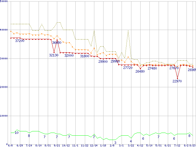 | WD1500AHFD (150.0GB)の価格推移 | | | (2006年6月8日~2007年8月23日) |
