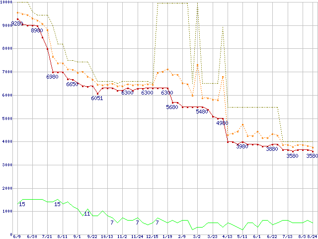 ※このグラフは過去のデータも税率5%相当に調整した税込み相当額のグラフです。 税率変更や、総額表示方式導入(2004年4月)の影響は除いています。 | | | ●凡例 | 最安値 (点線部は販売店未確認 または未調査) | 平均値 | 最高値 | ショップ数 |
