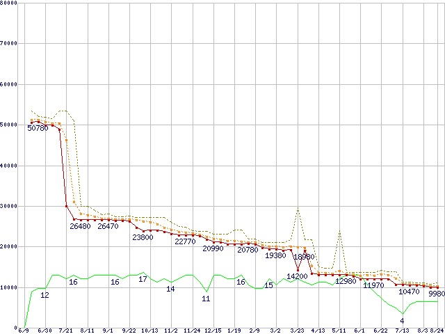 | Athlon 64 X2 4200+ (2.2GHz,L2 512KB×2,TDP65W)の価格推移 | | | (2006年6月9日~2007年8月24日) |