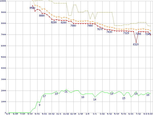 | HDT725025VLAT80 (250GB,8MB)の価格推移 | | | (2006年6月8日~2007年8月23日) |