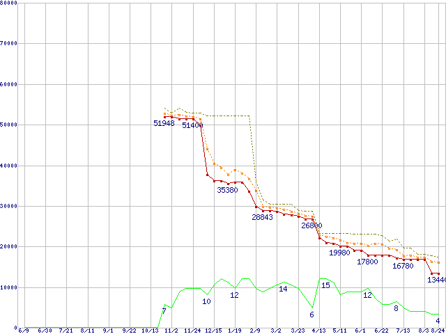 ※このグラフは過去のデータも税率5%相当に調整した税込み相当額のグラフです。 税率変更や、総額表示方式導入(2004年4月)の影響は除いています。 | | | ●凡例 | 最安値 (点線部は販売店未確認 または未調査) | 平均値 | 最高値 | ショップ数 |