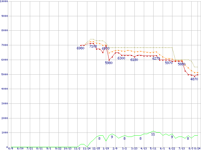 ※このグラフは過去のデータも税率5%相当に調整した税込み相当額のグラフです。 税率変更や、総額表示方式導入(2004年4月)の影響は除いています。 | | | ●凡例 | 最安値 (点線部は販売店未確認 または未調査) | 平均値 | 最高値 | ショップ数 |
