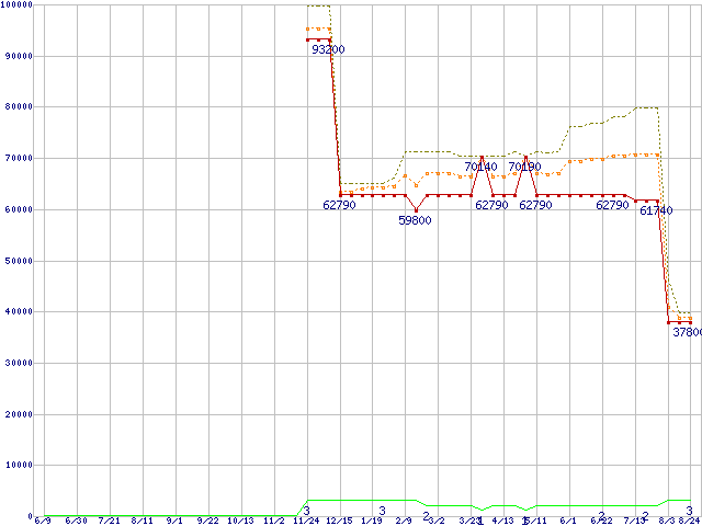 ※このグラフは過去のデータも税率5%相当に調整した税込み相当額のグラフです。 税率変更や、総額表示方式導入(2004年4月)の影響は除いています。 | | | ●凡例 | 最安値 (点線部は販売店未確認 または未調査) | 平均値 | 最高値 | ショップ数 |