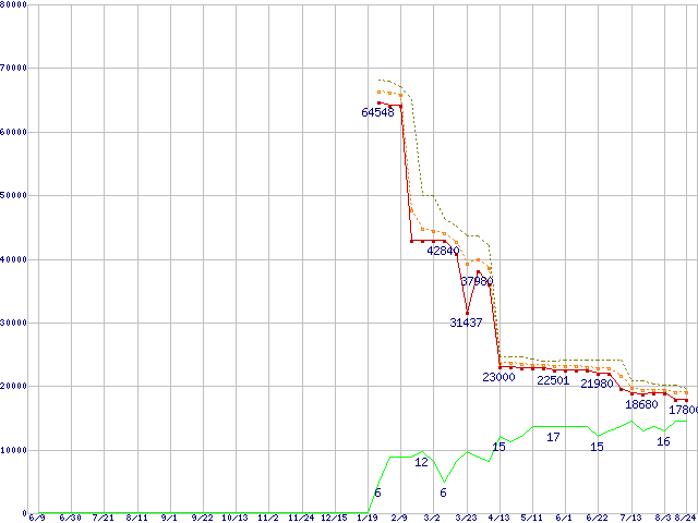 ※このグラフは過去のデータも税率5%相当に調整した税込み相当額のグラフです。 税率変更や、総額表示方式導入(2004年4月)の影響は除いています。 | | | ●凡例 | 最安値 (点線部は販売店未確認 または未調査) | 平均値 | 最高値 | ショップ数 |
