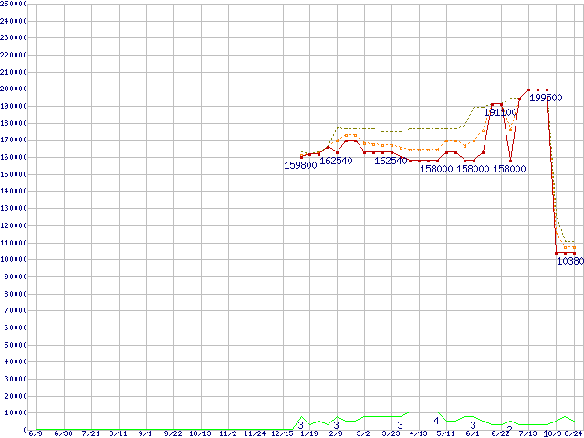※このグラフは過去のデータも税率5%相当に調整した税込み相当額のグラフです。 税率変更や、総額表示方式導入(2004年4月)の影響は除いています。 | | | ●凡例 | 最安値 (点線部は販売店未確認 または未調査) | 平均値 | 最高値 | ショップ数 |