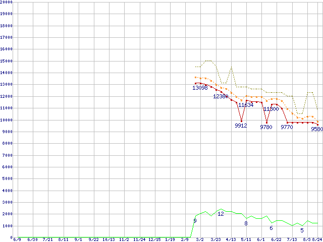 ※このグラフは過去のデータも税率5%相当に調整した税込み相当額のグラフです。 税率変更や、総額表示方式導入(2004年4月)の影響は除いています。 | | | ●凡例 | 最安値 (点線部は販売店未確認 または未調査) | 平均値 | 最高値 | ショップ数 |