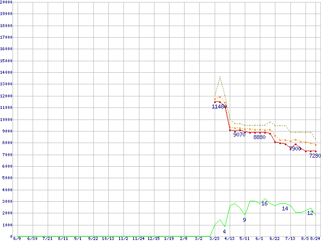 ※このグラフは過去のデータも税率5%相当に調整した税込み相当額のグラフです。 税率変更や、総額表示方式導入(2004年4月)の影響は除いています。 | | | ●凡例 | 最安値 (点線部は販売店未確認 または未調査) | 平均値 | 最高値 | ショップ数 |