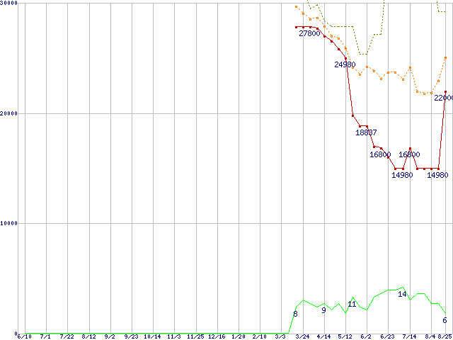 ※このグラフは過去のデータも税率5%相当に調整した税込み相当額のグラフです。 税率変更や、総額表示方式導入(2004年4月)の影響は除いています。 | | | ●凡例 | 最安値 (点線部は販売店未確認 または未調査) | 平均値 | 最高値 | ショップ数 |