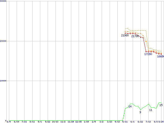 ※このグラフは過去のデータも税率5%相当に調整した税込み相当額のグラフです。 税率変更や、総額表示方式導入(2004年4月)の影響は除いています。 | | | ●凡例 | 最安値 (点線部は販売店未確認 または未調査) | 平均値 | 最高値 | ショップ数 |