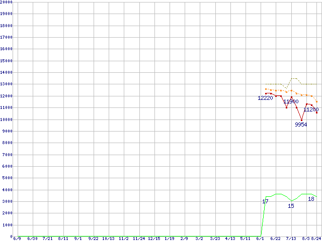 ※このグラフは過去のデータも税率5%相当に調整した税込み相当額のグラフです。 税率変更や、総額表示方式導入(2004年4月)の影響は除いています。 | | | ●凡例 | 最安値 (点線部は販売店未確認 または未調査) | 平均値 | 最高値 | ショップ数 |