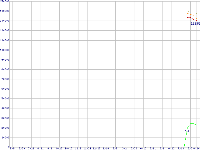 ※このグラフは過去のデータも税率5%相当に調整した税込み相当額のグラフです。 税率変更や、総額表示方式導入(2004年4月)の影響は除いています。 | | | ●凡例 | 最安値 (点線部は販売店未確認 または未調査) | 平均値 | 最高値 | ショップ数 |