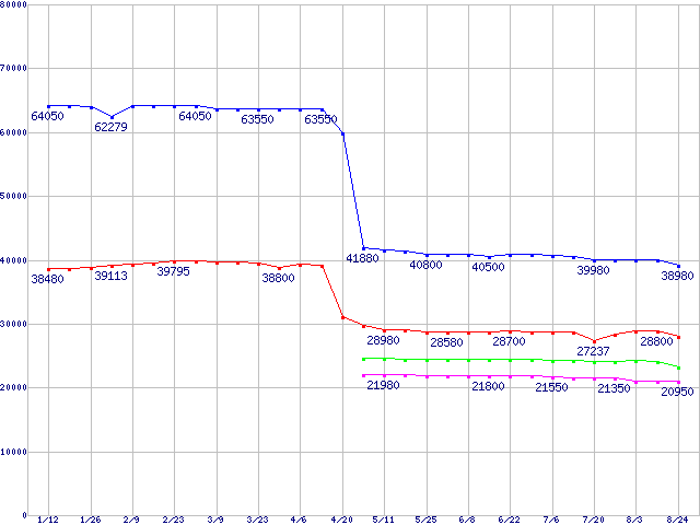| LGA775 (FSB 1066MHz,Dual Core,EM64T対応,TDP 65W)の最安値推移 | | | (2007年1月12日~2007年8月24日) |
