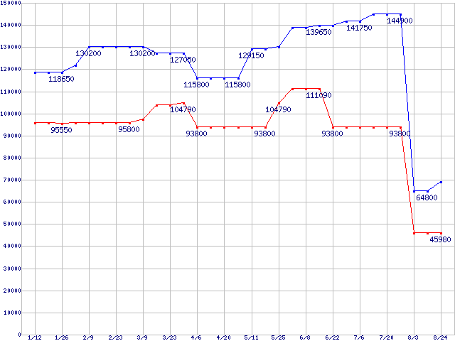 | LGA771(FSB 1333MHz,Quad Core,L2 4MB×2,TDP 80W)の最安値推移 | | | (2007年1月12日~2007年8月24日) |