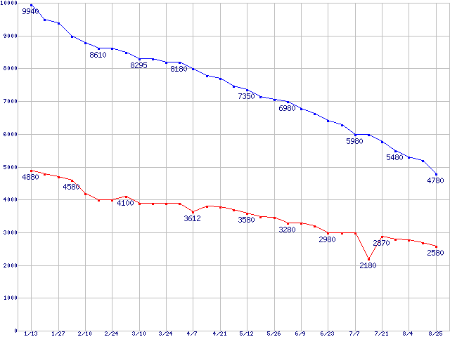 PC2-6400(DDR2-800) DDR2 SDRAM DIMMの最安値推移