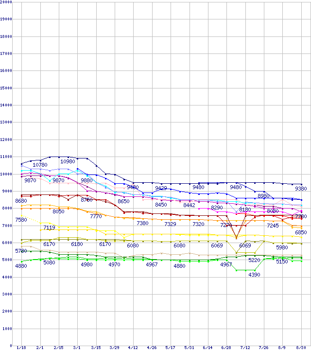 | HDD主要製品(最安値1万円未満)の最安値推移 | | | (2007年1月18日~2007年8月30日) |