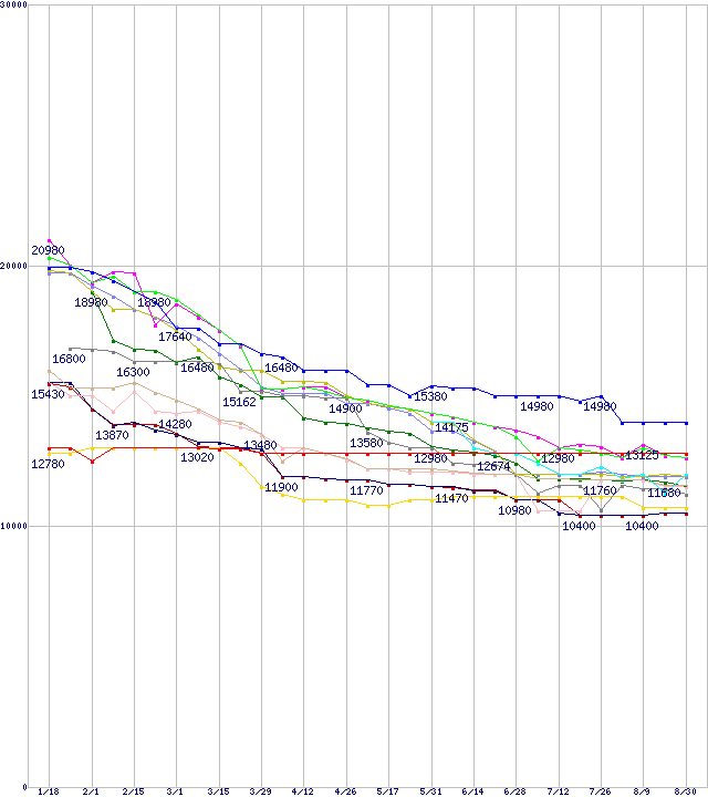 | HDD主要製品(最安値1万円~1万5千円未満)の最安値推移 | | | (2007年1月18日~2007年8月30日) |