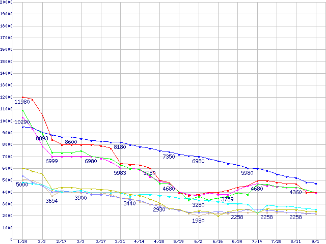 メモリ主要製品(最安値5千円~1万円未満)の最安値推移