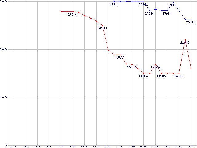 メモリ主要製品(最安値5千円~1万円未満)の最安値推移
