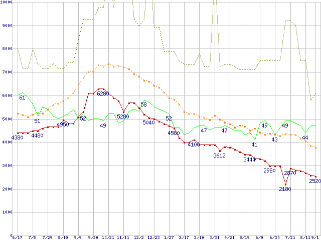 ※このグラフは過去のデータも税率5%相当に調整した税込み相当額のグラフです。 税率変更や、総額表示方式導入(2004年4月)の影響は除いています。 | | | ●凡例 | 最安値 (点線部は販売店未確認 または未調査) | 平均値 | 最高値 | ショップ数 |