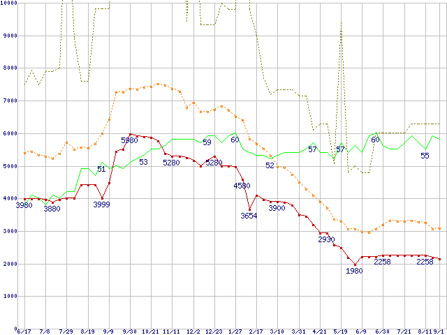 ※このグラフは過去のデータも税率5%相当に調整した税込み相当額のグラフです。 税率変更や、総額表示方式導入(2004年4月)の影響は除いています。 | | | ●凡例 | 最安値 (点線部は販売店未確認 または未調査) | 平均値 | 最高値 | ショップ数 |