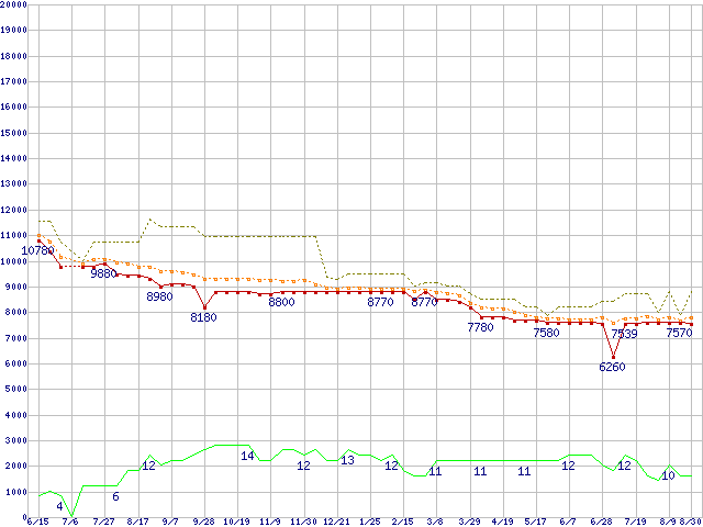 ※このグラフは過去のデータも税率5%相当に調整した税込み相当額のグラフです。 税率変更や、総額表示方式導入(2004年4月)の影響は除いています。 | | | ●凡例 | 最安値 (点線部は販売店未確認 または未調査) | 平均値 | 最高値 | ショップ数 |