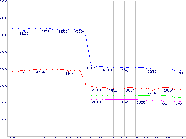 | LGA775 (FSB 1066MHz,Dual Core,EM64T対応,TDP 65W)の最安値推移 | | | (2007年1月19日~2007年8月31日) |