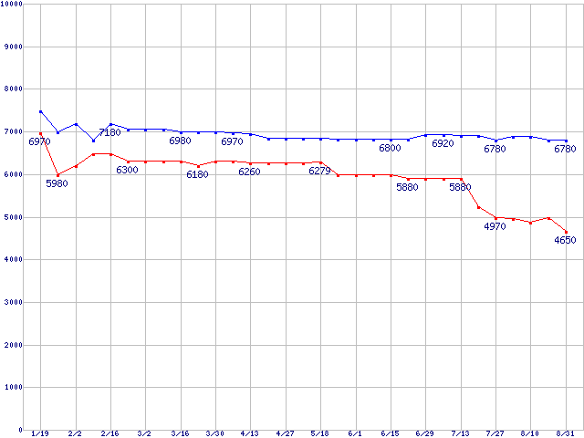 FSB 800MHz対応Core 2 Duo向けSocket (FSB 533MHz,Dual Core,EM64T対応)の最安値推移