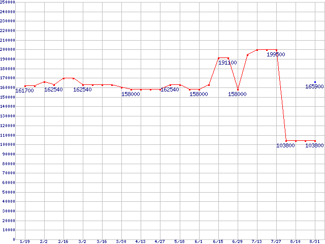 | LGA771(FSB 1333MHz,Quad Core,L2 4MB×2,TDP 120W)の最安値推移 | | | (2007年1月19日~2007年8月31日) |