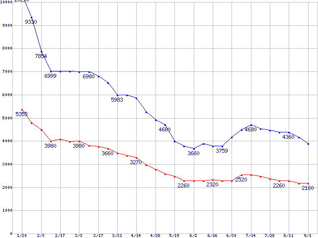 PC2-4200*(DDR2-533) DDR2 SDRAM DIMMの最安値推移