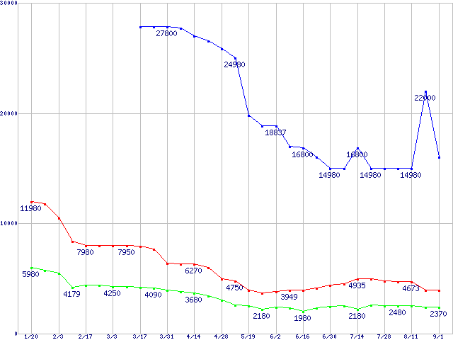 PC3200(DDR400) DDR SDRAM DIMMの最安値推移