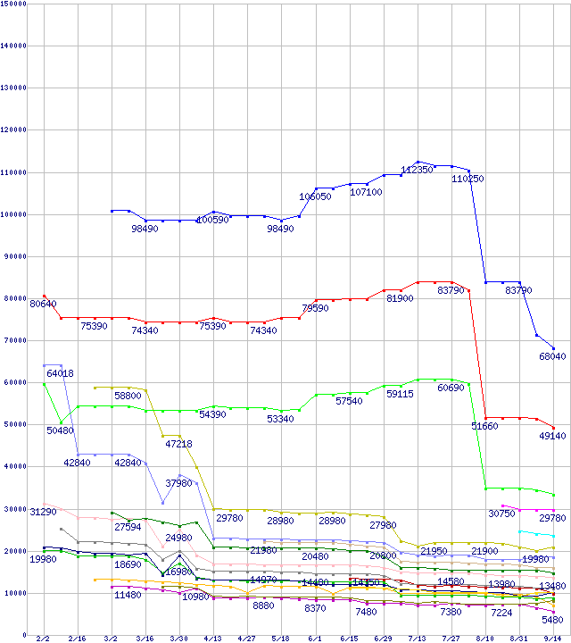 | AMD系CPUの最安値推移 | | | (2007年2月2日~2007年9月14日) |