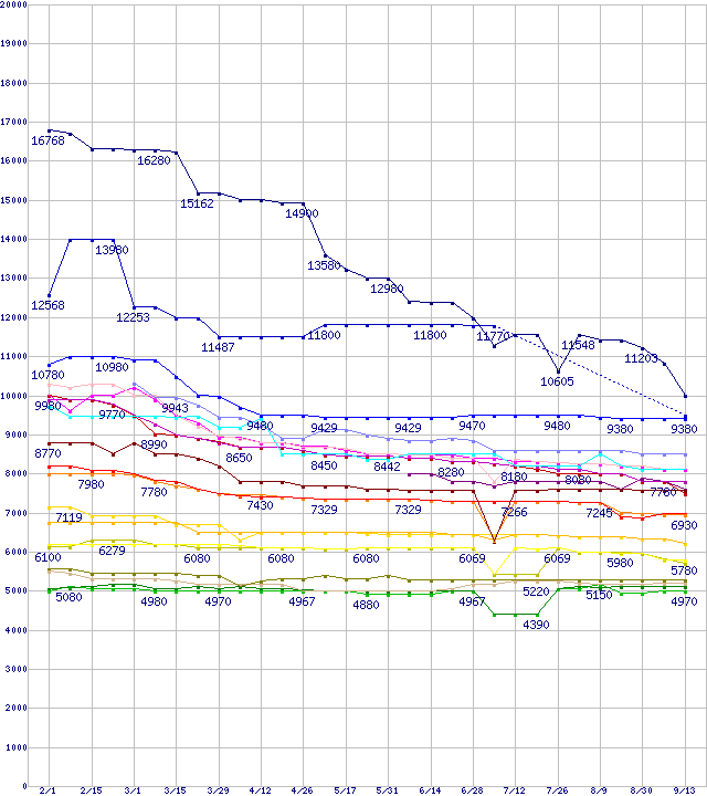 | HDD主要製品(最安値1万円未満)の最安値推移 | | | (2007年2月1日~2007年9月13日) |